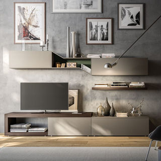 Per chi vuole un soggiorno moderno e personalizzato, grazie all'impiego di elementi, quali ripiani a giorno, pensili e basi.